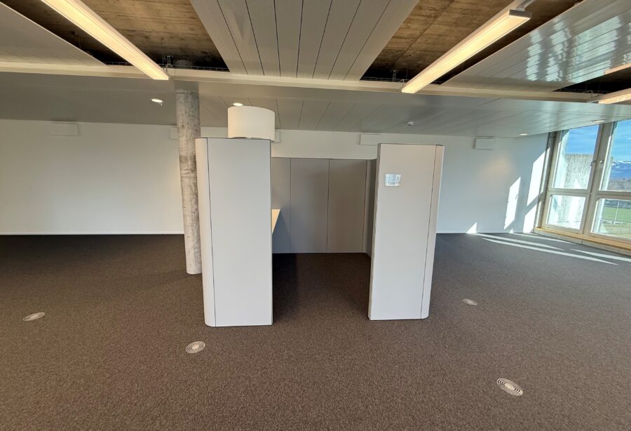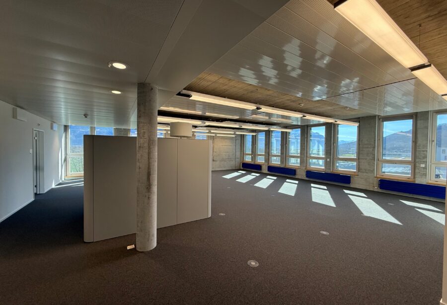 Ein hochwertiger Teppichboden sorgt für eine angenehme Raumakustik und ein komfortables Arbeitsumfeld. Integrierte FL-Leuchten sowie moderne Kühldecken gewährleisten optimale Lichtverhältnisse und eine angenehme Raumtemperatur zu jeder Jahreszeit.